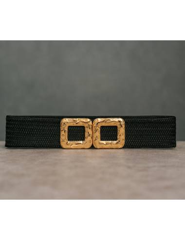 Cinturón elástico de diseño trenzado en color negro, perfecto para ajustar la cintura con estilo y comodidad. Destaca su doble hebilla cuadrada en acabado dorado martillado, que aporta un toque sofisticado y moderno. Un accesorio versátil y elegante, ideal para combinar con vestidos, monos o abrigos y realzar cualquier look con un detalle refinado.
