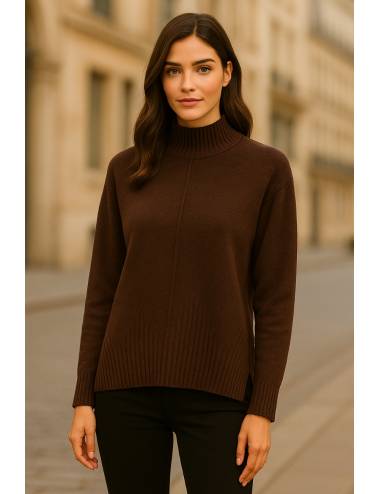 Suéter de punto en color marrón chocolate, presentado en una modelo alta, delgada y elegante. El diseño incorpora cuello chimenea acanalado, costura central y detalle de canalé en bajo y puños, aportando estructura y estilo. Su textura suave y caída perfecta lo convierten en una prenda cálida, versátil y sofisticada para looks casuales con un toque chic.