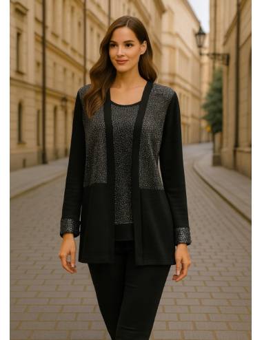 Suéter negro con tejido jaspeado en tono plateado, que aporta un brillo discreto y muy elegante. Su diseño recto y favorecedor hace que siente genial a todo tipo de cuerpos, mientras que el escote redondo y el acabado suave lo convierten en una prenda cómoda y versátil. Perfecto para combinar con la chaqueta a juego o para darle un toque sofisticado a cualquier look diario o de noche.