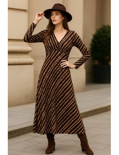 Vestido midi de estilo boho chic con un estampado en tonos tierra y negro que aporta movimiento y personalidad. Su escote en pico realza el cuello y estiliza la figura, mientras que el corte fluido ofrece comodidad y caída natural. Las mangas largas lo hacen perfecto para entretiempo. Ideal para combinar con botas y sombrero para un look moderno, relajado y muy elegante.