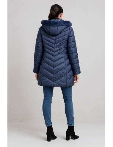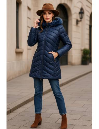 Abrigo acolchado en azul marino, ligero y súper cálido, ideal para el invierno. Su diseño entallado estiliza la figura, mientras que el largo medio aporta comodidad y protección. Incluye capucha con pelo suave, bolsillos con cremallera y acabado brillante muy elegante. Perfecto para un look urbano, moderno y femenino en los días fríos.