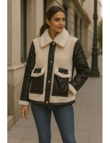 Cazadora estilo borreguito súper cálida y con mucho estilo. Combina cuerpo en tono crudo con mangas y detalles en negro para un contraste moderno y urbano. Incluye bolsillos amplios con solapa, botones dorados y cuello vuelto que aporta un toque elegante. Perfecta para los días fríos, cómoda, juvenil y muy favorecedora.
