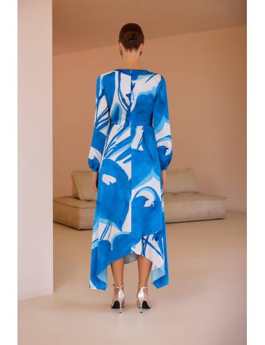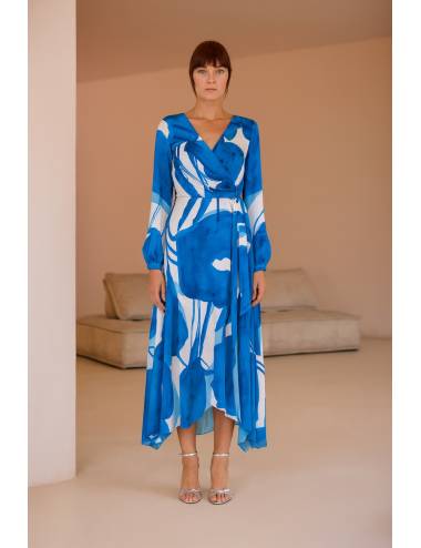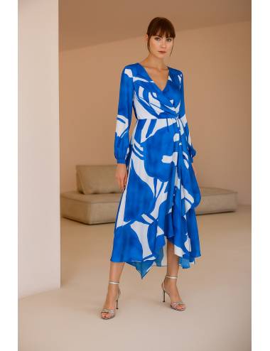Este espectacular vestido midi cruzado combina un estampado artístico en tonos azul intenso y blanco que aporta frescura y movimiento. Su caída ligera realza la silueta con un vuelo fluido y femenino, mientras que las mangas largas y el cinturón del mismo tejido estilizan la figura. Un diseño sofisticado, ideal para invitadas que buscan elegancia, comodidad y un toque moderno en cualquier evento especial.