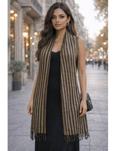 Pañuelo largo de rayas en tonos tierra, elegante y atemporal, perfecto para aportar estilo y calidez a cualquier look. Su tejido ligero y fluido cae con movimiento, estilizando la silueta y realzando conjuntos tanto casuales como más sofisticados. Ideal para el día a día o para completar un outfit urbano con un toque chic.