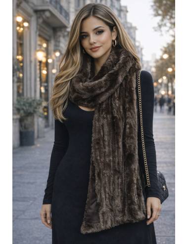 Bufanda de pelo suave en tono marrón chocolate, muy calentita y agradable al tacto, ideal para los días más fríos. Su textura mullida aporta elegancia y confort, elevando cualquier look invernal. Perfecta para llevar al cuello o caída, combina fácilmente con prendas básicas y añade un toque sofisticado y femenino a conjuntos urbanos.