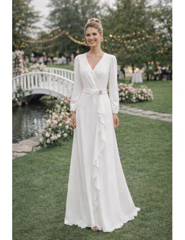 Vestido largo de estilo elegante y muy favorecedor, con escote en pico que estiliza el cuello y realza el pecho con delicadeza. El cuerpo va ajustado para definir la silueta, mientras que la falda fluida aporta movimiento y ligereza al caminar. Las mangas largas equilibran el diseño y aportan sofisticación. Incluye cinturón que marca la cintura y eleva el conjunto, ideal para celebraciones especiales, bodas al aire libre, novia civil o mamá de comunión.