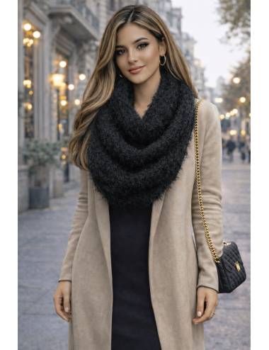 Bufanda tipo cuello con un acabado suave y esponjoso que aporta calidez y estilo al instante. Su diseño envolvente permite llevarla cómodamente sin perder forma, creando un efecto elegante y moderno alrededor del cuello. Ideal para elevar cualquier look diario, combina a la perfección con prendas lisas y abrigos, aportando textura y un toque sofisticado. Una pieza práctica y estilosa, perfecta para los días más frescos.