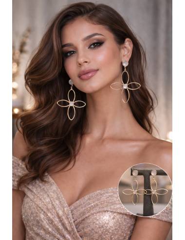 Pendientes dorados con diseño floral calado y centro en tono nácar. Ligeros, elegantes y con movimiento, aportan un toque sofisticado y femenino ideal para eventos y looks especiales.