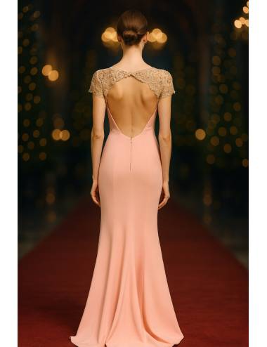 Vestido largo de corte sirena en tono nude, confeccionado en un tejido fluido que se adapta con elegancia a la silueta. Presenta unas delicadas mangas cortas de encaje dorado con motivos florales, que aportan un toque sofisticado y femenino. El diseño destaca por su sencillez refinada y su caída natural, ideal para eventos de gala o celebraciones donde se busca una imagen elegante y distinguida.