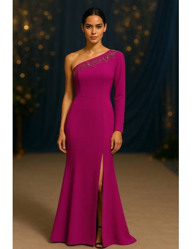 Vestido largo asimétrico de corte sirena en un elegante tono malva. Destaca por su sofisticado diseño de un solo hombro con manga larga y espectacular bordado de pedrería en el escote, que aporta luz y distinción. La abertura frontal en la falda añade un toque de sensualidad sin perder la elegancia. Ideal para bodas, celebraciones o eventos especiales.