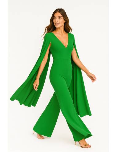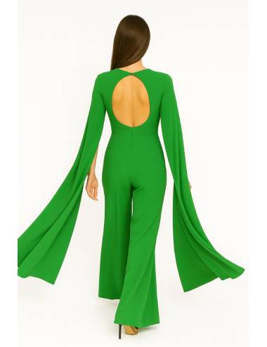 Mono largo en color verde vibrante, con un diseño moderno y sofisticado. Presenta un elegante escote en pico en la parte delantera y un espectacular escote redondo en la espalda que aporta un toque atrevido y femenino. Las mangas tipo capa caen con fluidez hasta el suelo, creando un efecto de movimiento y distinción. El corte recto y amplio del pantalón estiliza la figura, convirtiéndolo en una prenda ideal para eventos, celebraciones y ocasiones especiales donde destacar con estilo.