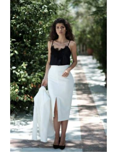 Conjunto elegante y femenino compuesto por un top negro de tirantes con delicado encaje, que aporta un toque sensual y sofisticado. Se combina con una falda blanca lápiz de tiro alto y abertura frontal, que estiliza la silueta y añade movimiento. El look se completa con tacones negros y una chaqueta blanca, logrando un equilibrio perfecto entre modernidad y distinción.