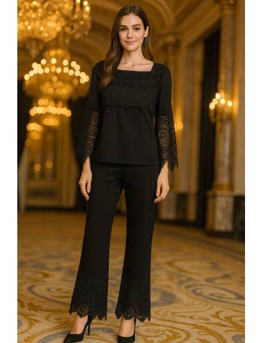 Este conjunto negro es pura elegancia y distinción. Está compuesto por una blusa de manga larga con delicados encajes florales tanto en el pecho como en los puños, que aportan un toque sofisticado y femenino. El pantalón, de corte recto y tejido fluido, incorpora el mismo encaje en el bajo, creando una armonía perfecta entre ambas piezas. Los tacones de salón estilizan la silueta y realzan la caída del conjunto, ideal para un evento de noche o una ocasión especial. El resultado es un look refinado, moderno y con un encanto atemporal.